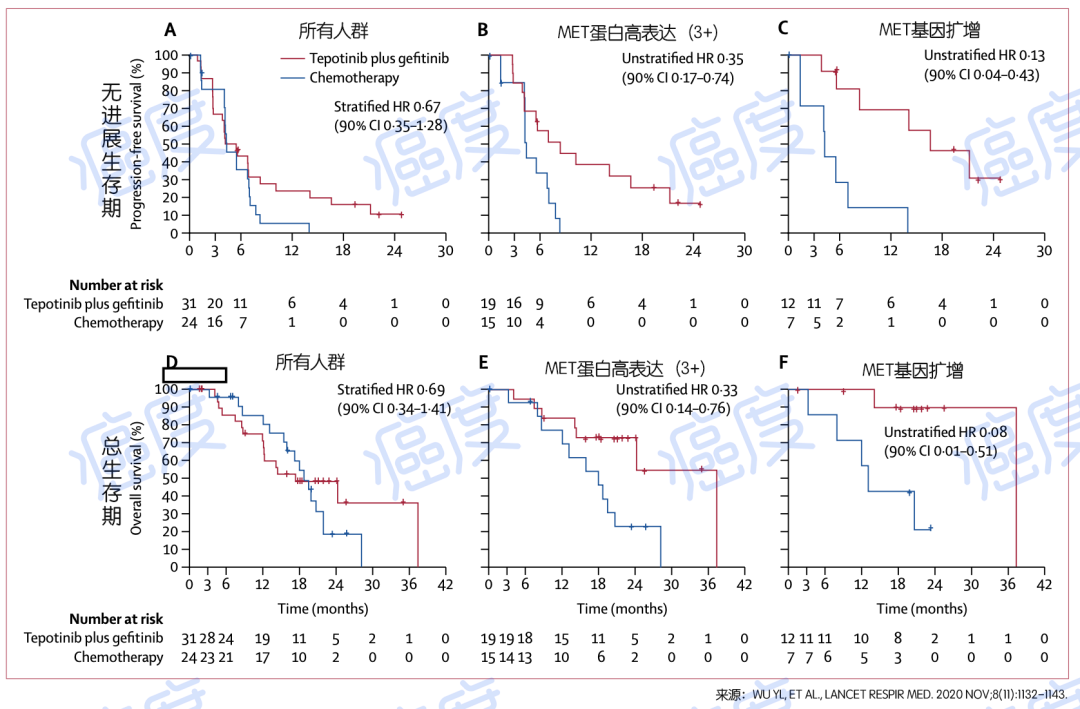 在MET蛋白高表达的患者中(免疫组化3个加号),特泊替尼联合吉非替尼的中位无进展生存期为8.3个月,而对照化疗组的中位无进展生存期为4.4个月。中位总生存期也出现显著的差异,两组患者分别为37.3个月和17.9个月。