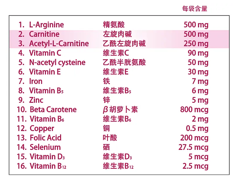 - 外加14种其它卵子生长必须的维生素、矿物质和氨基酸
