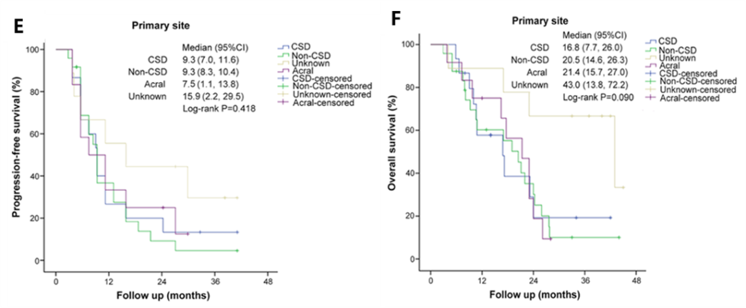 在按照临床原发部位分型的分析中,肢端黑色素瘤患者(N = 12)占有一定比例,其ORR、PFS和OS分别为88.9%(95% CI,71.1 ~ 100)、7.5个月和21.4个月。在本次数据分析中,双靶治疗在肢端患者中的疗效与非肢端患者无显著差异(P > 0.05)。这对临床来说是一个非常好的提示,因为中国黑色素瘤肢端患者比例更高,但由于样本量小,我们期待看到更多来自于中国实践的数据。