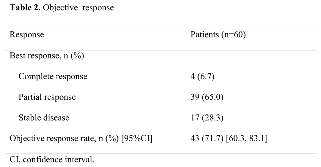 该项研究共纳入2014年3月~2017年11月入组的61例中国患者(NCT02083354试验,1例患者入选后撤回同意退出研究,未接受D+T治疗)。在60例患者中,完全缓解4例(6.7%)。部分缓解39例(65.0%),疾病稳定17例(28.3%),总体ORR为71.7%(95% Cl 60.3 ~ 83.1)。