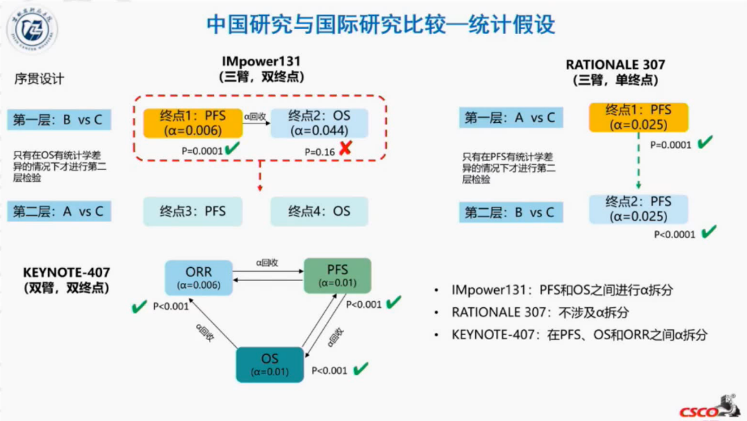 对有关中国肺鳞癌患者的临床研究(RATIONALE 307研究、KEYNOTE-407研究、IMpower131研究)的试验设计进行对比分析,可以看到,RATIONALE 307研究设计参考了KEYNOTE-407、IMpower131研究的设计理念,区别在于,RATIONALE 307研究为3臂、单终点,不涉及&α;拆分,该研究设计与其阳性结果有着密切的相关性。