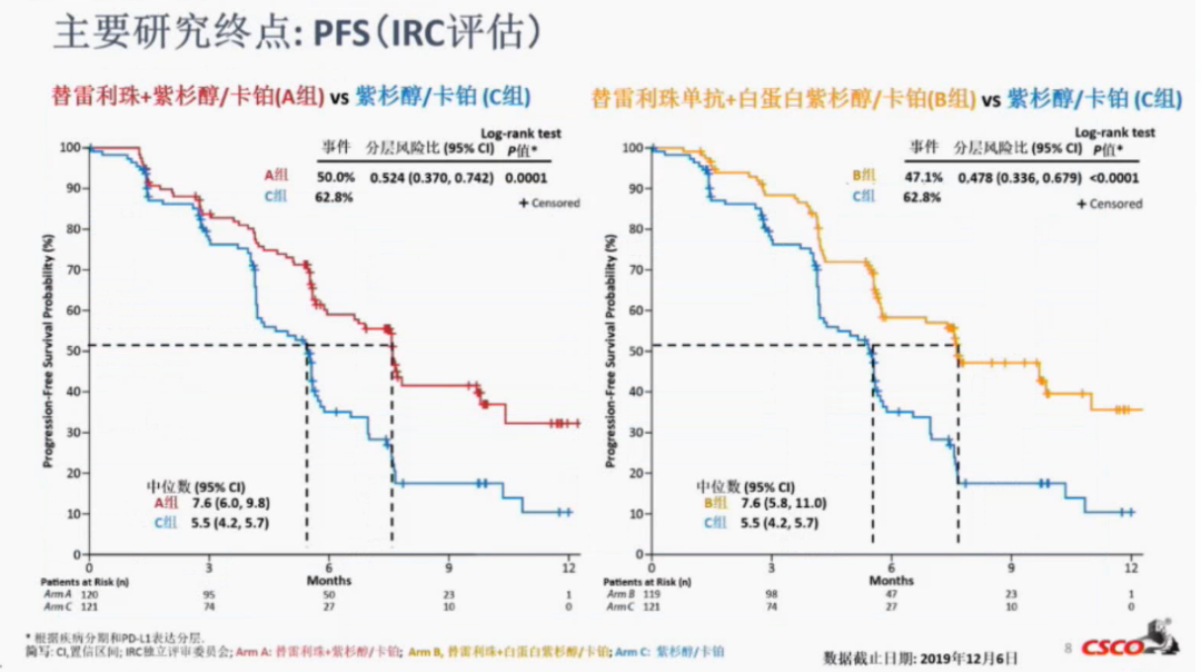截至2019年12月6日,A组和B组患者的中位PFS均达7.6个月,显著高于单纯化疗组的5.5个月;风险比HR分别为0.52(P=0.0001)和0.48(P<0.0001),这意味着与单纯化疗组相比,使用替雷利珠单抗联合化疗方案的A组和B组治疗分别使患者的疾病进展风险显著降低了48%和52%(图2)。