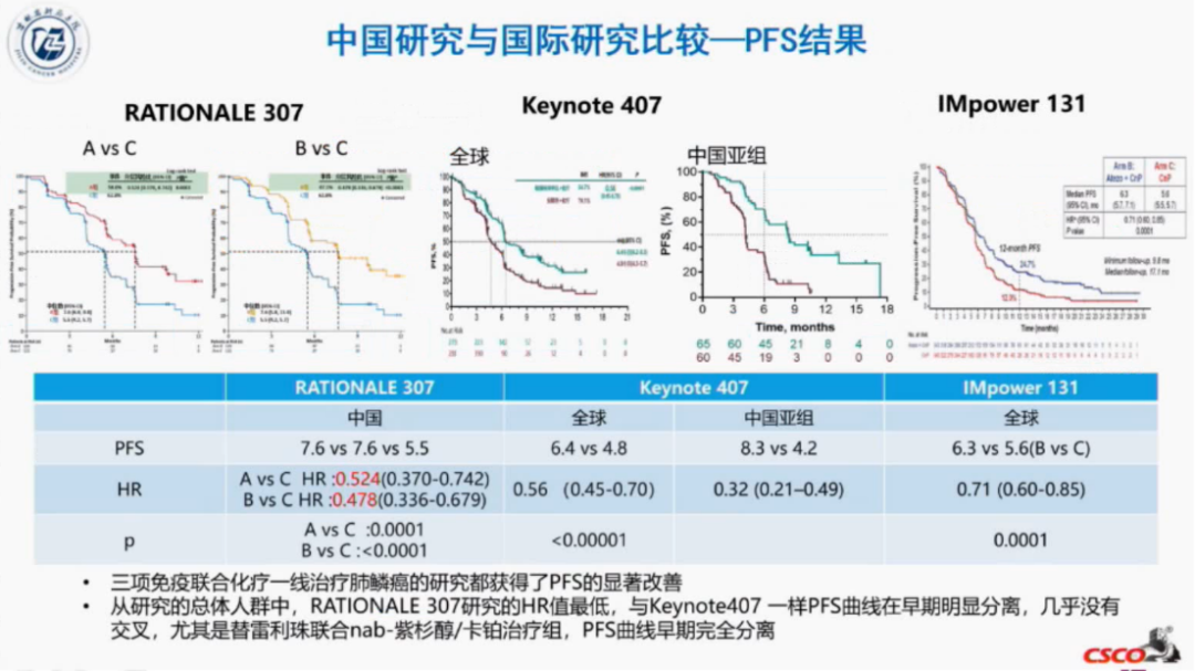 图8 RATIONALE 307、KEYNOTE-407、IMpower131研究PFS结果
