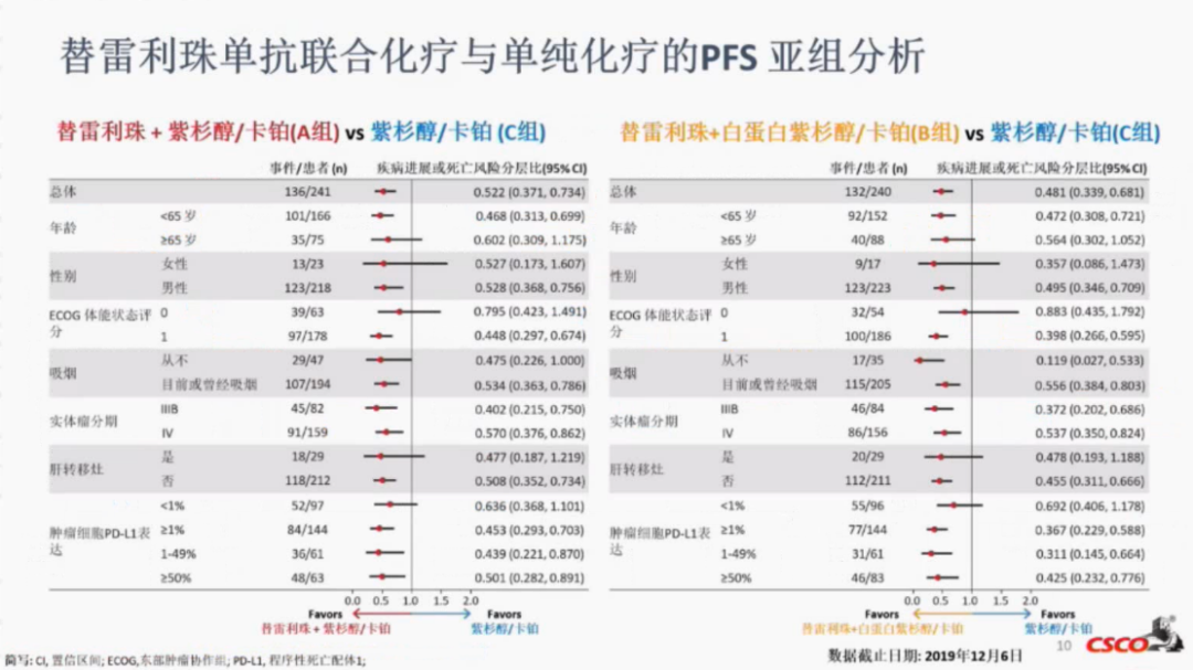 继而对替雷利珠单抗联合化疗与单纯化疗的PFS进行了亚组分析,显示替雷利珠单抗联合化疗对比单纯化疗,可显著改善PFS(图3)。