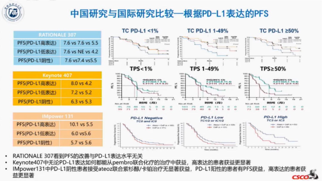 对以上三项研究中患者的PFS、PD-L1亚组的PFS等进行分析,显示三项免疫联合化疗一线治疗肺鳞癌的研究均获得了PFS的显著改善(图8)。但KEYNOTE-407研究、IMpower131研究数据显示PD-L1高表达患者获益更显著,而RATIONALE 307研究中PFS改善与患者PD-L1表达水平无关(图9)。