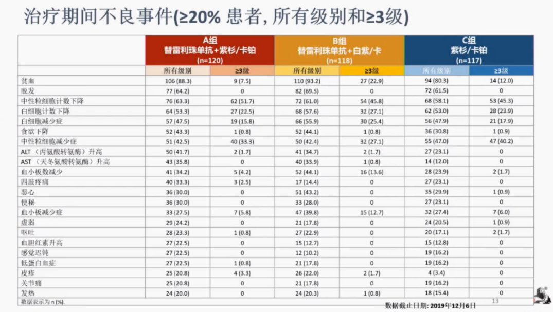 安全性方面,三组的整体不良事件(包括≥3级)的发生率与频率相近,联合治疗组不良事件的发生率略高于单纯化疗组,报告的TRAEs与已知的双药化疗安全性谱一致(图6)。最常见的与任何研究治疗药物相关不良事件主要为血液学毒性,白蛋白紫杉醇组的神经毒性显著低于紫杉醇组。大多数潜在免疫相关不良事件为低或中度,可管理(未接受皮质类固醇治疗,也未导致替雷利珠单抗停药);在标准化疗基础上联合替雷利珠单抗治疗未出现新的安全信号。