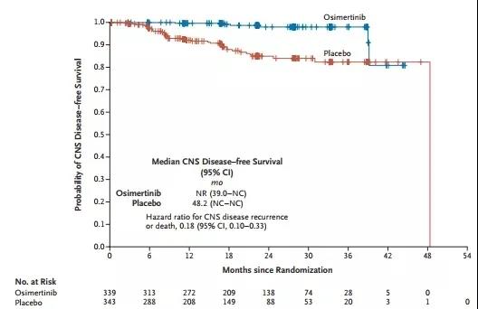两组中,分别有2%和11%患者发生中枢神经系统(CNS)相关疾病复发或死亡,分别有1%和10%患者发生CNS复发。两组中,无CNS相关疾病患者的24个月存活率为98%和85%(HR=0.18),这提示,奥希替尼使降低82%的CNS疾病复发或死亡风险,两组的中位CNS无疾病生存期分别为未达到和48.2个月。