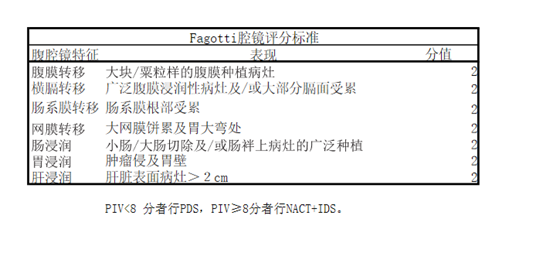 晚期卵巢癌的标准化治疗包括手术及以铂类为主的辅助化学治疗。对于部分晚期卵巢癌患者,初始手术治疗有时难以彻底切除肿瘤,实现满意的肿瘤减灭术。对于卵巢癌术前评估,目前临床上广泛应用的主要有两种:Suidan’sCT评分标准及Fagotti的腹腔镜评分标准。另附PCI评分、R0评分系统及并发症评分。