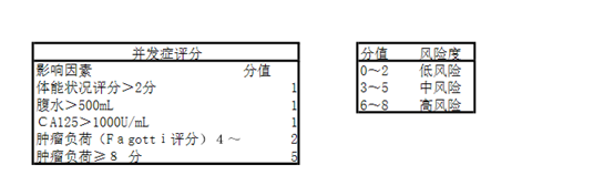 Vizzielli 等于 2016 年就预测患者术后并发症的发生风险建立了一个新的评分机制。体能状况评分>2分(1分)、腹水>500mL(1分)、 CA125>1000 U/mL(1分)、肿瘤负荷(Fagotti评分)4~8分(2 分)、肿瘤负荷≥8 分(5 分)。研究发现评分0~2分的人群为低风险人群;评分 3~5 分的人群为中等风险人群;评分6~8 分的人群为高风险人群。这个模型意义在于可以指导术者术前决定治疗方案,但也存在一定缺陷,比如模型中的肿瘤负荷需要术中探查才能评分,这就限制了其术前评估的能力。该研究是单中心,虽然样本量大, 但还是需要更多的研究去证实。