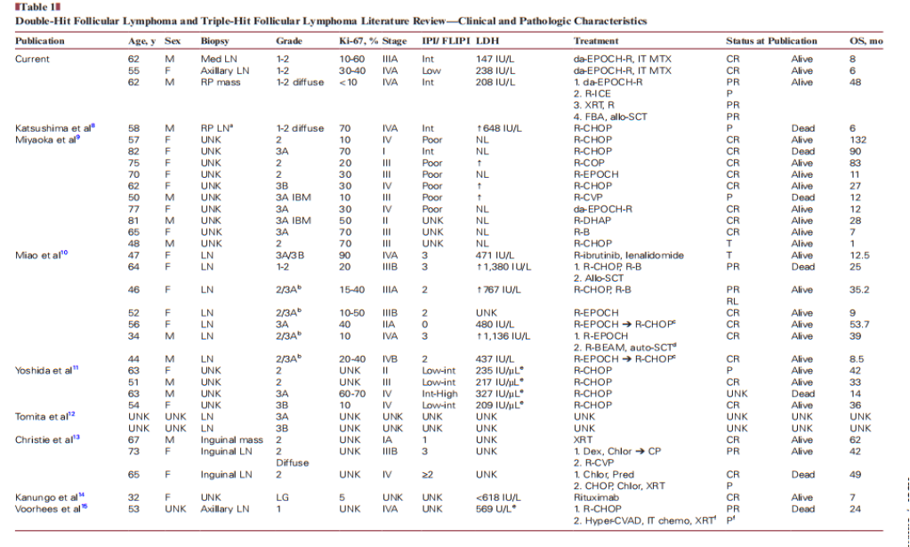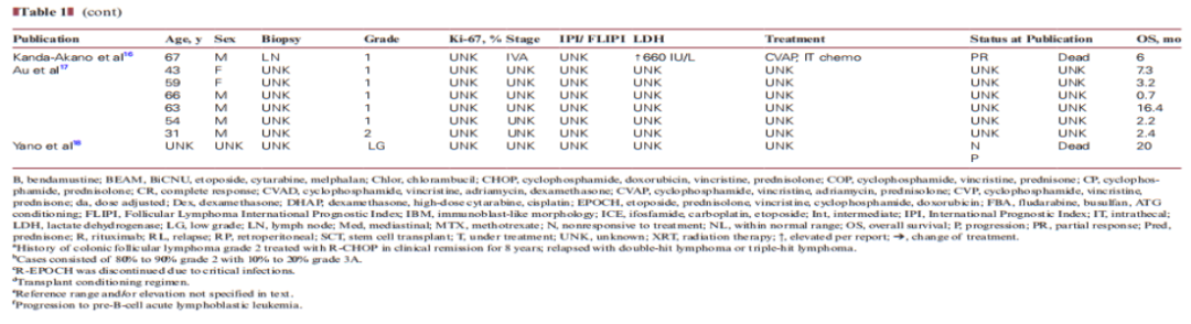 那么,DHFL的生物学行为到底是会像FL一样呈现为惰性呢还是会像DHL一样呈现为侵袭性呢?我们首先来看一下近年来报道的DHFL病例的临床特点。