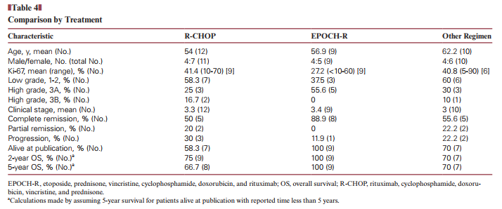 38.7%的患者接受了R-CHOP方案化疗,29%接受R-EPOCH方案化疗,32.3%接受了其他方案的治疗。其中接受R-EPOCH方案者治疗有效率更高(CR 66.6%,PR 33.3%),采用R-CHOP方案治疗者50%获得CR,20%获得PR,30%患者出现PD。表4提示对于DHFL采用R-CHOP方案可能并不是最优选择。