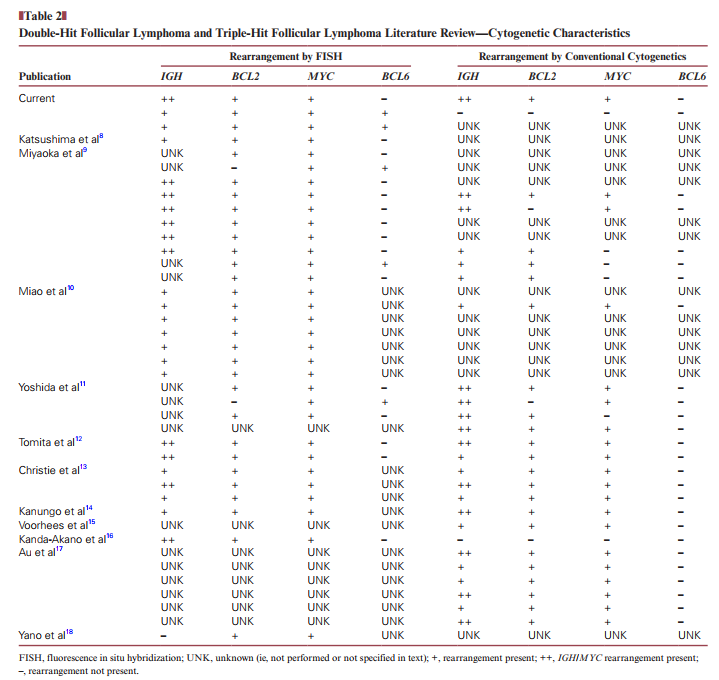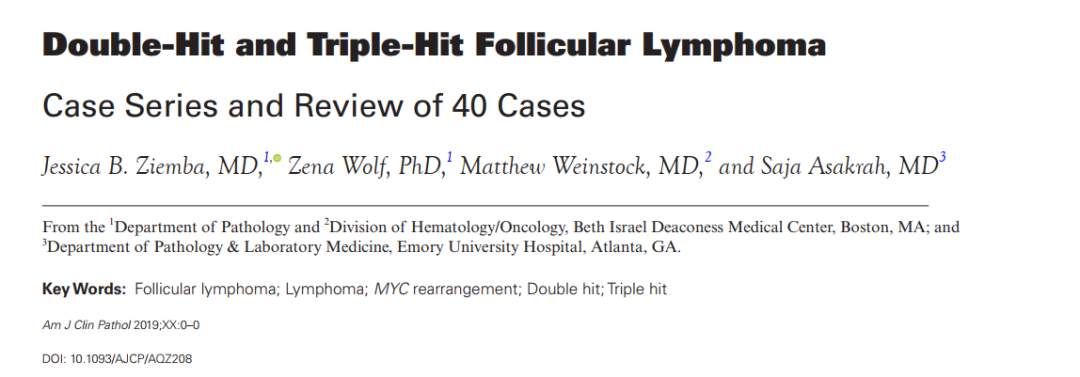 1. Jessica B. Ziemba, Zena Wolf, Matthew Weinstock, et al. Double-Hit and Triple-Hit Follicular Lymphoma.Am J Clin Pathol. 2020 Apr 15;153(5):672-685. doi: 10.1093/ajcp/aqz208.PMID: 32112707