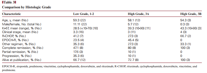 40例DHFL患者荟萃分析,平均年龄55岁(31~82岁),男:女=1:1.25,约60%患者为1-2级FL。1-2级患者获得部分缓解(PR)者(17.6%)和进展(PD)患者(35.5%)较多,3A-3B级获得完全缓解(CR)者(84.6%)更多,这可能与高级别FL患者接受更高强度的化疗有关。
