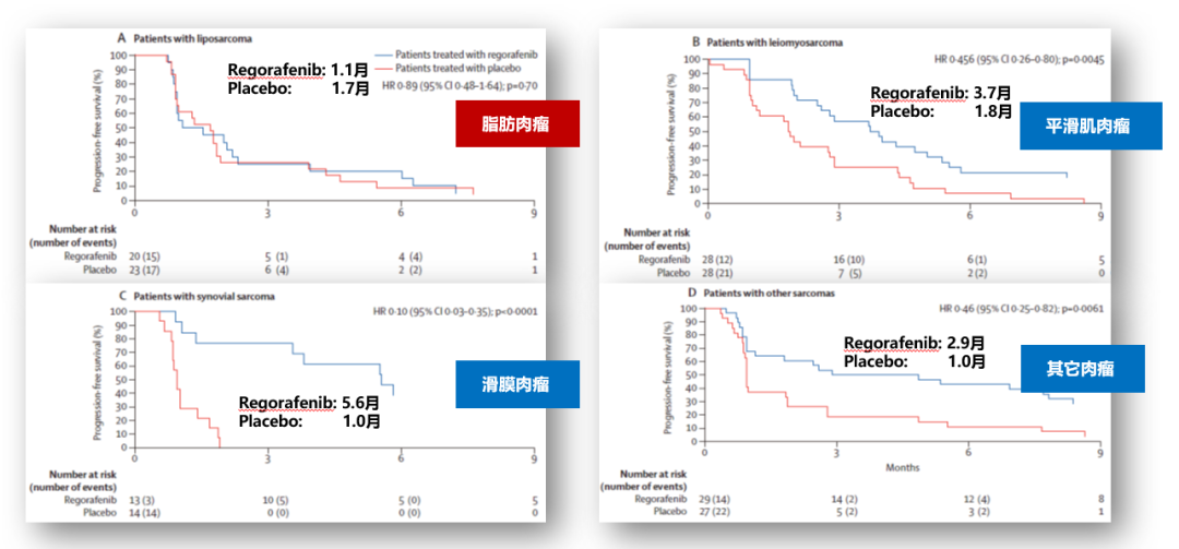 REGOSARC研究显示,瑞戈非尼可延长多柔比星治疗失败的非脂肪肉瘤的PFS(4.0 个月Vs 1.0 个月,P <0.0001),对滑膜肉瘤和平滑肌肉瘤效果较好,对脂肪肉瘤无效。