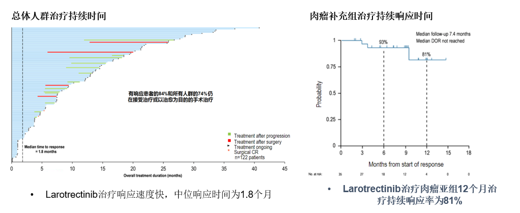 拉罗替尼响应速度快,中位响应时间为1.8个月。治疗肉瘤亚组12个月,治疗持续响应率为81%。这表明,拉罗替尼不仅响应速度快,且响应时间久。