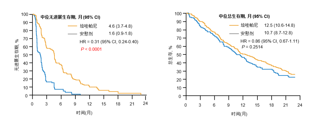 PALETTE(EORTC 62072)是一项Ⅲ期随机对照研究。结果显示,与安慰剂相比,培唑帕尼可延长患者的PFS(mPFS: 4.6个月 Vs 1.6个月,HR=0.35,P<0.0001),两组的OS无显著差异(12.5个月 Vs 11 个月,P =0.25)。