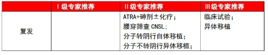 一般采用亚砷酸+ATRA±蒽环类化疗进行再次诱导治疗。诱导缓解后必须进行鞘内注射,预防中枢神经系统白血病(CNSL)。