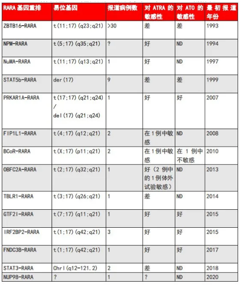 表4. 14种变异型APL的基因和染色体异常及对ATRA、ATO的治疗反应