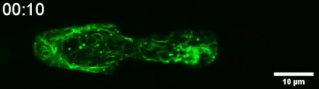 下面这段视频捕捉到了角蛋白在挤压过程中如何聚集在细胞核末端的过程。角蛋白是构成细胞骨架的三种纤维网络之一的组成部分。它在快速构建和拆卸细胞骨架方面发挥着重要作用。