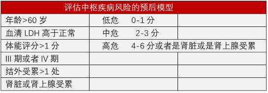 德国高级别淋巴瘤研究组(the German High Grade NHL Study Group)和英国剑桥癌症协会(BCCA)开发和验证了CNS-国际预后指数(IPI)作为CNS侵犯的危险分层工具。