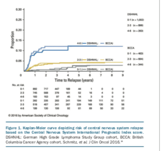 使用该模型预测2年的CNS复发率是分别是0.8%,3.9%和12%,差异具有统计学意义。另外一项BCCA的研究纳入了1597例病例(详见下图1),也证实了上述结果。在两个研究中还发现:>一个结外的部位,睾丸、眼眶受累,心包受累和骨髓侵犯也属于CNS侵犯的高危因素。