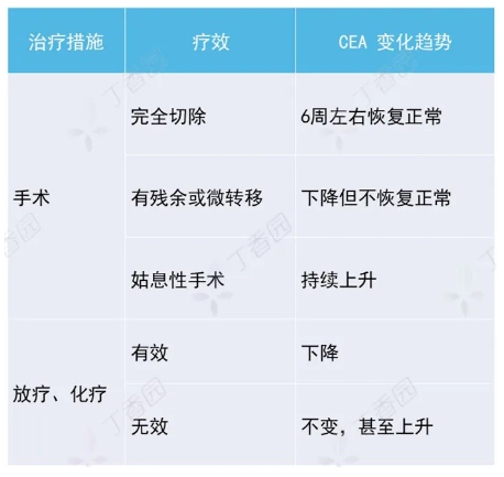 CEA 浓度越低, 说明分期越早,肿瘤转移、复发的可能越小,其生存时间越长; 反之,浓度越高,说明分期越晚, 切除难度越大,预后越差;