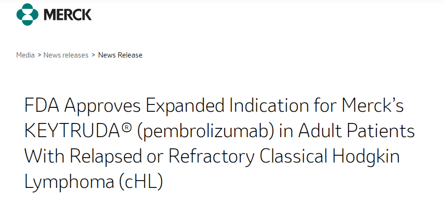 10月15日,默沙东(MSD)宣布其抗PD-1疗法帕博利珠单抗获得美国食品药品监督管理局(FDA)批准扩大新适应证,单药治疗复发性或难治性经典型霍奇金淋巴瘤(cHL)成人患者。新闻稿指出,帕博利珠单抗是首个获批治疗接受过一线疗法的复发/难治性cHL成人患者的抗PD-1疗法。FDA同时还批准了帕博利珠单抗用于难治性cHL,或经二线及二线以上治疗后复发的cHL儿童患者。