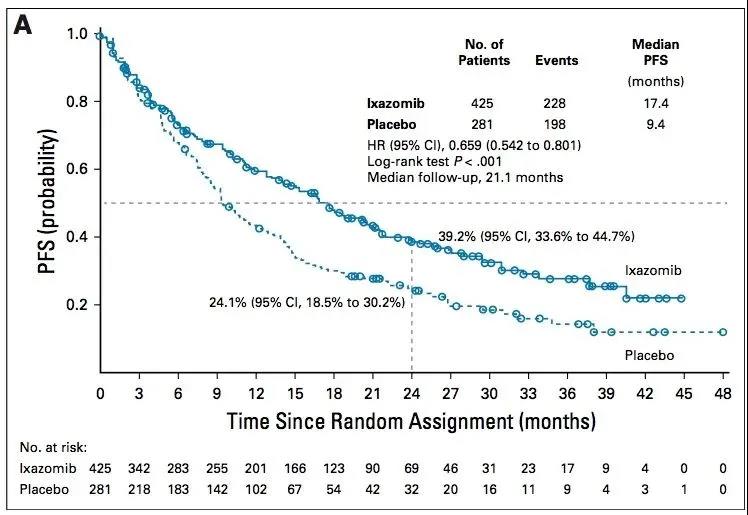 与安慰剂组相比,伊沙佐米组的进展或死亡风险显著降低了34.1%(HR 0.659;95%CI,0.542~0.801;P<0.001);随机化后伊沙佐米组和安慰剂组的中位pfs分别为17.4个月(95%ci,14.8~20.3个月)和9.4个月(95%ci,8.5~11.5个月;图1)。