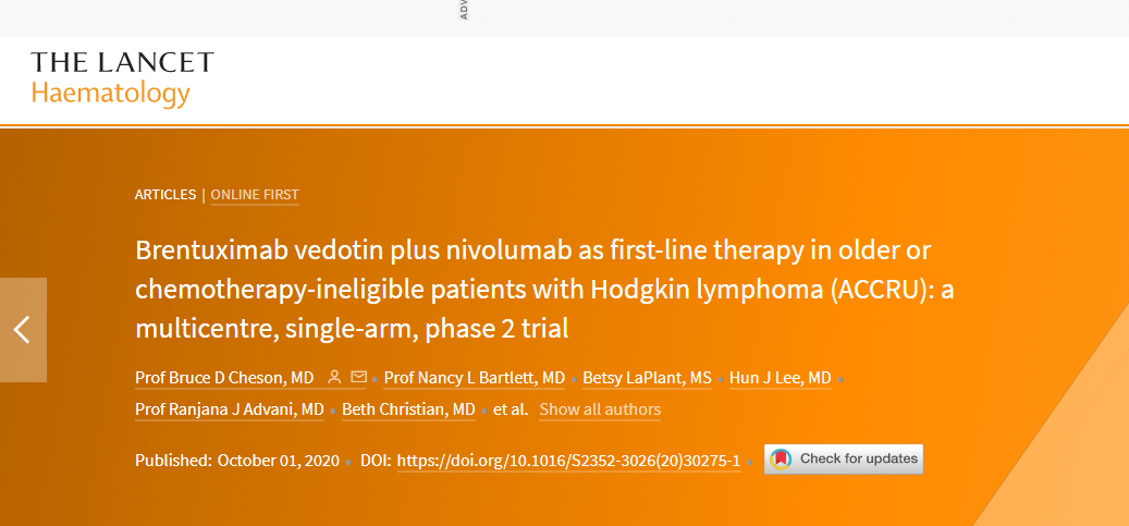 近日一项关于Brentuximab-vedotin联合O药用于老年霍奇金淋巴瘤患者的多中心、单臂、Ⅱ期临床试验结果发表在Lancet Haematology上。