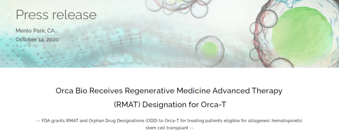 Orca Bio 10月14日宣布:FDA已经授予该公司的细胞疗法Orca-T再生医学高级疗法认定(RMAT)。Orca-T是一种在研同种异体、高精度细胞疗法,适用于适合造血干细胞移植的血液癌症患者。此外,Orca-T还获得了FDA授予的孤儿药资格,用于增强造血干细胞移植手术的细胞定植。