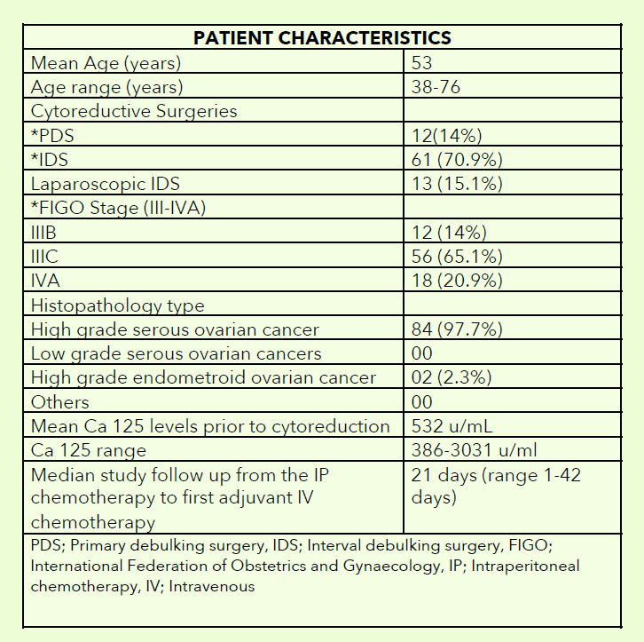 共有86名患者接受了术中单剂量卡铂IP治疗。12例(14%)患者接受了初始肿瘤细胞减灭术(PDS), 74例(86%)患者接受了中间型肿瘤细胞减灭术(IDS)。13例(15.1%)患者接受了腹腔镜/机器人IDS。所有患者对腹腔内卡铂耐受良好,无不良反应或不良反应极小。3例(3.5%)因腹部切口破裂需要缝合,3例(3.5%)发生麻痹性肠梗阻3-4天,1例(1.2%)因出血再次开腹探查,1例(1.2%)因晚期脓毒症死亡。86例患者中有84例(97.7%)可以按时进行预定的静脉化疗。