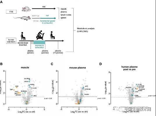 此外,研究人员还研究了这些代谢物在人体运动后是如何变化的。他们从8名经过30分钟高强度自行车运动的健康男性身上提取了血液样本,发现由运动诱导的代谢物也同样在人体中释放出来,并证实剧烈运动会改变血浆和淋巴器官的代谢状况。