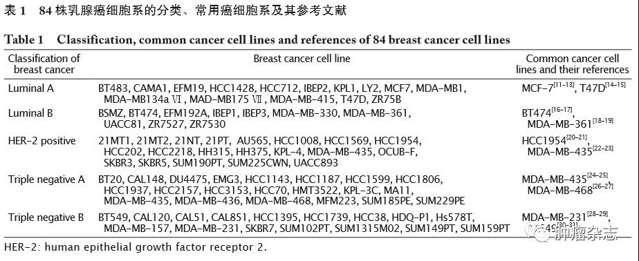 近年来,在构建乳腺癌模型方面对乳腺癌细胞系的应用较多。不过仅MCF-7、T47D和MDA-MB-231等细胞在乳腺癌细胞系的研究中被频繁使用[10],其他癌细胞在乳腺癌的研究中应用较少,这使得研究者们对乳腺癌细胞系的认识仍十分局限,只对几种细胞系的了解较深入。对此,本文总结归纳了84株乳腺癌细胞系的分类[10]和广泛用于乳腺癌研究的细胞系(表1),以供研究者根据实验研究的需要,选择相应的乳腺癌细胞株构建模型。