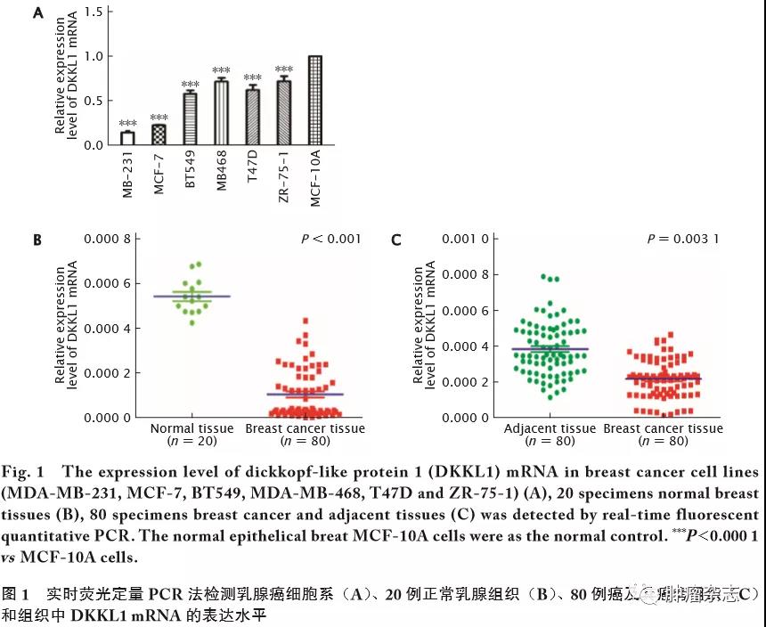 Conclusion: DKKL1 expression is down-regulated in breast cancer cell lines and tissues, and DKKL1 may be a functional tumor suppressor regulating tumorigenesis of breast cancer by antagonizing Wnt/&β;-catenin signaling pathway.