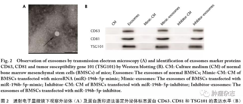 收集未转染miRNA的BMSCs以及转染了miR-196b-5p-mimic(或inhibitor)的BMSCs培养上清液各10 mL,4 ℃ 1 572×g离心15 min。取上清液,加入1/5体积的Exosome Precipitation Solution混匀后,4 ℃过夜。400×g离心15 min,弃上清液。PBS重悬后清洗细胞,400×g离心15 min,弃上清液,加入适量PBS制成外泌体悬液。将外泌体悬液滴加于铜网上,静置5 min,醋酸铀避光染色5 min,双蒸水清洗后滤纸吸干,透射电子显微镜下观察外泌体形态并拍照。