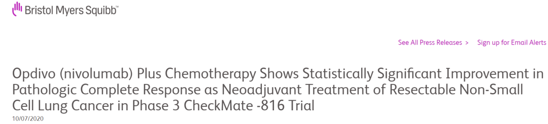 [1]. https://news.bms.com/news/corporate-financial/2020/Opdivo-nivolumab-Plus-Chemotherapy-Shows-Statistically-Significant-Improvement-in-Pathologic-Complete-Response-as-Neoadjuvant-Treatment-of-Resectable-Non-Small-Cell-Lung-Cancer-in-Phase-3-CheckMate--816-Trial/default.aspx