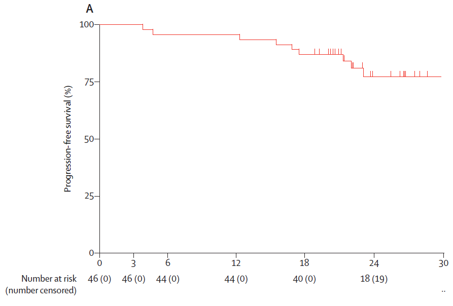 经过中位24月随访,2年无进展生存率为77.1%,2年生存率为89.9%。