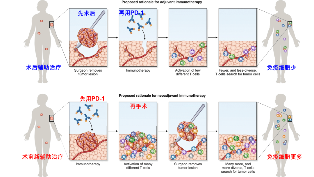 术后辅助治疗:也就是把肿瘤先切掉,再用PD-1抗体防止复发,这样做可以保证手术顺利进行,但也有一个问题,切除了肿瘤也意味着抗原的丢失,PD-1使用后能够激发起来的免疫反应可能会弱一些,表现为图右侧患者体内留存的肿瘤特异性免疫细胞少。