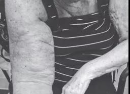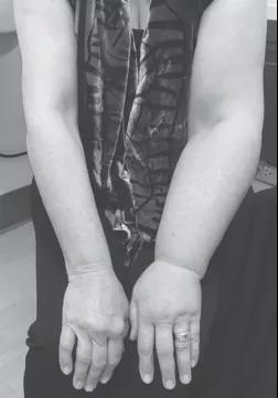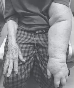 初期的淋巴水肿是出现明显的可凹陷性的肿胀,如图一所示。此时通过物理康复和梯度压力袖套等方式能够在一定程度上恢复。