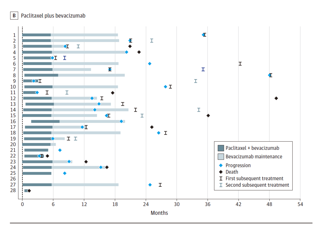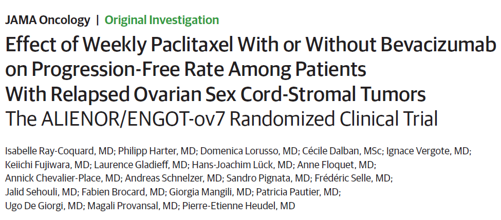 参考文献:Ray-Coquard I, Harter P, Lorusso D, Dalban C, Vergote I, Fujiwara K, Gladieff L, Lück HJ, Floquet A, Chevalier-Place A, Schnelzer A, Pignata S, Selle F, Sehouli J, Brocard F, Mangili G, Pautier P, De Giorgi U, Provansal M, Heudel PE. Effect of Weekly Paclitaxel With or Without Bevacizumab on Progression-Free Rate Among Patients With Relapsed Ovarian Sex Cord-Stromal Tumors: The ALIENOR/ENGOT-ov7 Randomized Clinical Trial. JAMA Oncol. 2020 Oct 8:e204574. doi: 10.1001/jamaoncol.2020.4574. Epub ahead of print. PMID: 33030515; PMCID: PMC7545353.