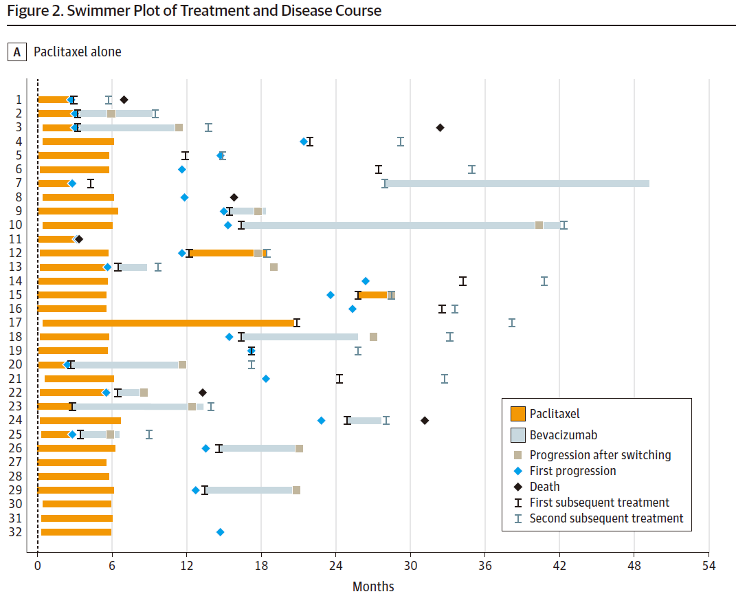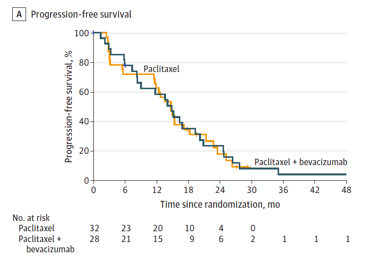 60例患者(主要是颗粒细胞肿瘤患者)被随机分配,32例接受紫杉醇单药治疗(纳入时中位年龄[四分位范围] 60[53-64]岁),28例接受紫杉醇-贝伐珠单抗治疗(纳入时中位年龄[四分位范围] 55[47-61]岁;1例未接受治疗)。紫杉醇单药组6个月无进展生存率为71%(95%CI,55%-84%),紫杉醇-贝伐珠单抗组为72%(95%CI,55%-87%)。联合用药6个月无进展生存率高于紫杉醇单药的贝叶斯估计概率为57%,低于预定义的优势阈值。但紫杉醇-贝伐珠单抗组的客观缓解率44%(95%CI, 26%-65%)高于紫杉醇单药组25%(95%CI, 12%-43%)。1例患者因毒性6个月内停止联合治疗。