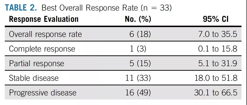 35例患者中33例可评估疗效,中位随访时间为13.0个月(1.3~43.5个月)。根据RECIST 1.1有6例患者出现缓解,ORR为18%(95%CI, 7.0%~35.5%),其中1例为完全缓解(CR),5例为部分缓解(PR)。