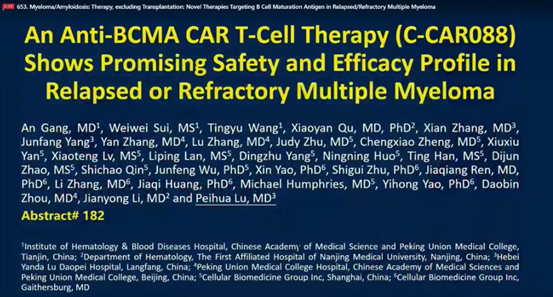 今年ASH大会上,在陆道培医院入选的5篇口头报告中,一项由四个中心(陆道培医院、江苏省人民医院、中国医学科学院血液病医院、北京协和医院)进行的抗BCMA CAR-T细胞在多发性骨髓瘤(MM)中疗效和安全性的研究备受瞩目。陆佩华教授介绍,C-CAR088是一种靶向BCMA的新型二代以4-1BB为共刺激因子的CAR-T细胞,在MM细胞上特异性高表达。