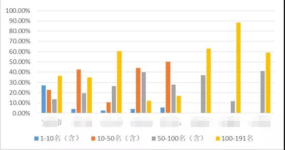 与此同时,现有信息平台还能够实现基于统筹地区的统计分析。如下图所示,蓝色是信用评价排名1-10名定点医疗机构的数量在全统筹地区所有定点医疗机构数量的占比。以此类推,橙色是排名10-50名的占比;灰色是排名50-100名的占比;黄色是100-191名的占比。通过柱状图,可以非常清晰地看到不同些统筹地区医疗机构的整体信用评价情况,比如有的地区橙色柱形图非常高,说明其区域内的定点医疗机构信用评价排名整体靠后,基金使用效率和基金安全水平可能较低,属于需要重点巡查的地区。