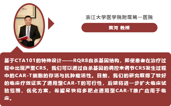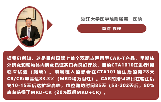2020年12月6日(太平洋时间),黄河教授在美国血液学会年会(ASH 2020)中发表了关于一项CRISPR/Cas9工程改造的通用CAR-T细胞产品(CTA101)用于复发/难治性B细胞急性淋巴细胞白血病(ALL)的安全性和有效性的口头报告。