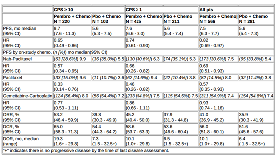 研究纳入ECOG PS 0-1 847例患者,并按2:1比例随机分配接受帕博利珠单抗+化疗(白蛋白紫杉醇,紫杉醇,或吉西他滨/卡铂)或安慰剂+化疗,至多给予35周期帕博利珠单抗或安慰剂,直至疾病进展或出现无法耐受的毒性。不允许交叉治疗。分层因素包括化疗类型(紫杉烷类vs吉西他滨/卡铂)、PD-L1状态(CPS≥1 vs <1)和既往是否接受过同类型辅助治疗或新辅助治疗。双重主要终点为由盲化孤立中央评估的PD-L1阳性肿瘤(CPS≥10和≥1)患者以及所有患者的PFS和总生存期(OS)。次要终点包括客观缓解率(ORR)和疾病控制率(DCR,CR + PR + SD ≥24周)和缓解持续时间(DOR)。