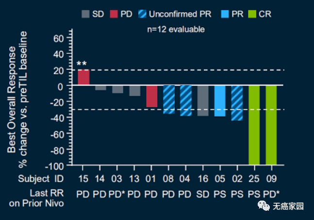 这项试验共有32名患者参加,最终有16名患者接受TILS治疗,其中12名患者可以评估。在平均随访1.4年时,3名患者病情缓解,其中两名完全患者,并且已超过一年。另一名患者的缓解即将得到确认。