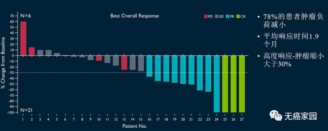 1、44%(12名)的患者有效果,包括1名完全应答,9名部分应答和2个未确认的部分应答;
