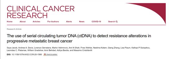 2020年12月15日,Clinical Cancer Research在线发表一篇关于循环肿瘤DNA(ctDNA)检测的回顾性队列研究,研究使用ctDNA来检测进展期转移性乳腺癌的耐药性变化。研究结果显示,通过连续ctDNA检测证实其耐药性改变确实与疾病进展有关。另外,研究者认为纵向ctDNA评估有望追踪肿瘤基因组的变化进展。