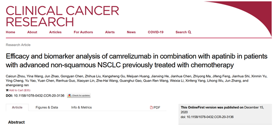 [2]Caicun Zhou,Yina Wang,Jun Zhao,Gongyan Chen,Zhihua Liu,Kangsheng Gu,Meijuan Huang,Jianxing He,Jianhua Chen,Zhiyong Ma,Jifeng Feng,Jianhua Shi,Xinmin Yu,Ying Cheng,Yu Yao,Yuan Chen,Renhua Guo,Xiaoyan Lin,Zhe-Hai Wang,Guanghui Gao,Quan Ren Wang,Weixia Li,Xinfeng Yang,Lihong Wu,Jun Zhang and shengxiang ren.Efficacy and biomarker analysis of camrelizumab in combination with apatinib in patients with advanced non-squamous NSCLC previously treated with chemotherapy.Clin Cancer Res December 15 2020.